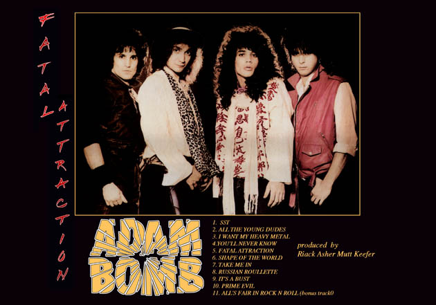 For more info about Adam Bomb, including their album titles, release dates, members, Gregg's take on Jimmy, and a rare pic, read my INTERVIEW WITH GREGG GERSON ON ADAM BOMB AND JIMMY RIGHT HERE! UPDATE: THE ADAM BOMB ALBUM "FATAL ATTRACTION" HAS BEEN RE-RELEASED ON CD. TO GET YOURSELF A COPY, CONTACT GetAnimal@aol.com! Click to enlarge pictures |